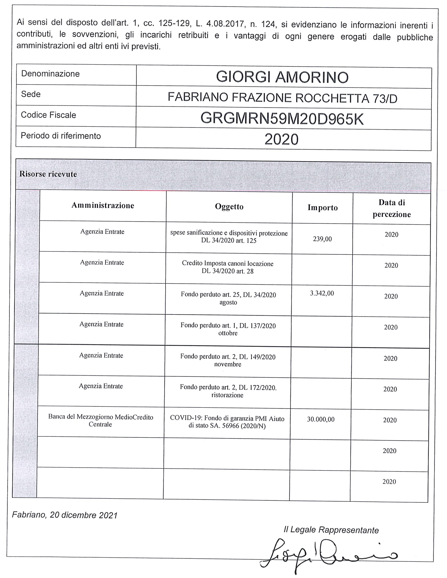 Pubblicazione delle informazioni ai sensi dell'art. 1, cc. 125-129, L. 4.08.2017, n. 124
